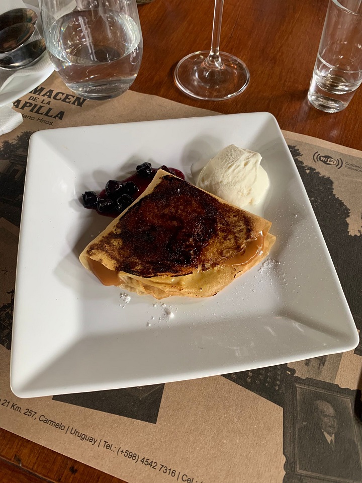Bij de lunch koos ik voor iets typisch Uruguayaans: dulce de leche. Het nationale lievelingsproduct – ook het favoriete dessert van koningin Máxima. Een flensje met warme dulce de leche, een bolletje romig ijs en zwartebessenjam. Mierenzoet, maar in balans. Een gerecht dat tegelijk eenvoud en traditie uitstraalt. En misschien ook wel een stukje identiteit.