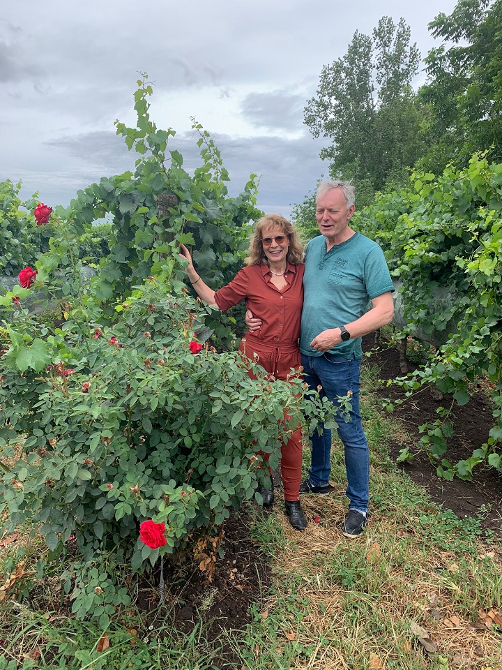 De eigenaar vertelde over parkieten – felgroene, slimme vogels die verzot zijn op druiven. Elke verjagingspoging doorzien ze na een paar keer. Ze blijven rustig eten. Aan het begin van iedere druivenrij groeit een rozenstruik. Is die gezond, dan zijn de druiven dat ook. De natuur als signaalgever.