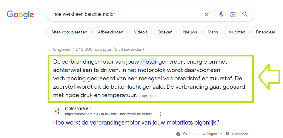 Een ander zoekmachine gerelateerd voordeel zijn de "SERP features" ook wel "rich content" genoemd. Het groen gearceerde blok in de afbeelding hieronder laat zien wat hiermee bedoeld wordt. Wanneer je in je artikel over bijvoorbeeld auto's een kop over verbrandingsmotoren hebt, en daaronder weer een subtitel over benzinemotoren kan de zoekmachine dit exacte stuk in je artikel lezen en dit als "rich content" bovenaan de zoekresultaten plaatsen. Wanneer je dit consistent aanhoudt kan jouw website een autoriteit worden binnen je vakgebied.