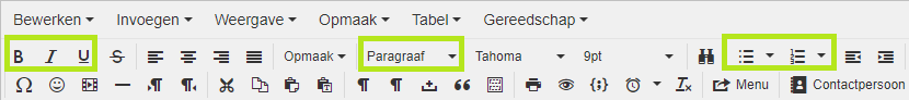 Ook bij deze elementen is het belangrijk dat hiervoor de correcte manier van opmaken word gebruikt. Dit doe je door de toolbar bovenin de tekstverwerker van je website te gebruiken. Voor zowel de titels als alle andere hiërarchische elementen geldt; bevalt de opmaak niet, vraag dan om een wijziging in de template en ga niet zelf in de tekstverwerker de tekst opmaken.