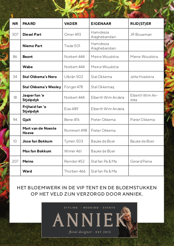 Drenthe, en in het bijzonder Norg, is waar wij wonen en werken. Sponsoring is voor ons een manier om bij te dragen aan de regio en de lokale gemeenschap. Onze schoondochter Anniek, eigenaresse van Anniek Floral Designer, is tweevoudig winnaar van de titel Beste Bloemist van Nederland. Zij verzorgt onder andere de aankleding van evenementen en was dit jaar verantwoordelijk voor het bloemwerk in de VIP-tent en de prachtige bloemstukken in het veld.