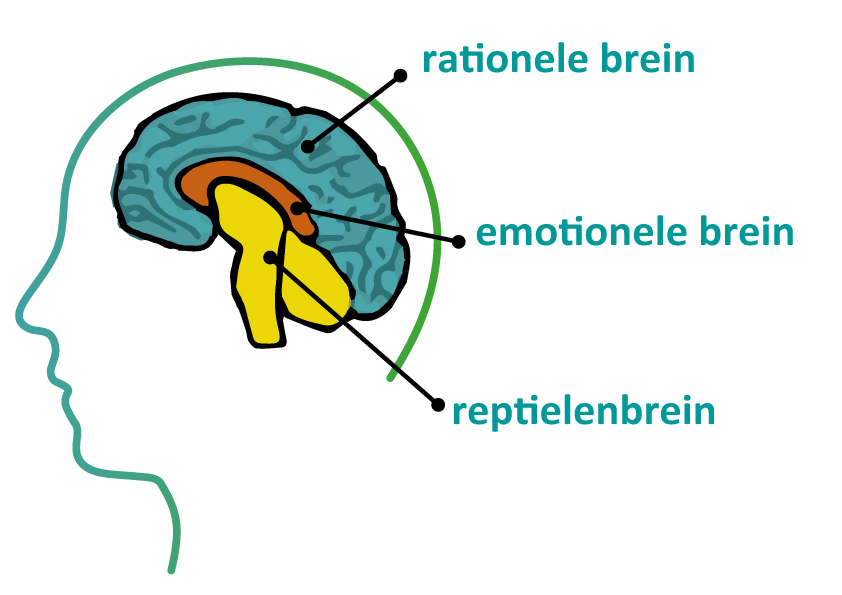 - Het reptielen brein: dit gedeelte controleert onze primaire levensbehoeften. Zo krijgen we een seintje uit onze hersenen dat ons ‘hongergevoel’ activeert. Uit dit deel komt ook de bekende fight-or-flight-reactie vandaan.